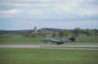 Hunter T.7A with 40th anniversary markings taxying to Runway 05 at RAF Lossiemouth in the Summer of 1993. |